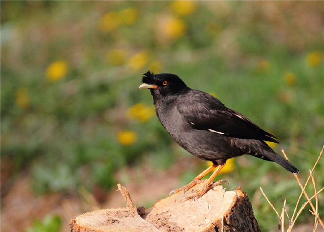 八哥(普通八哥、鴝鵒)Acridotheres cristatellus:是我國南方常見鳥類,自陜西南部至長江以 南各省,以及臺灣和海南省均有分布。原僅分布于我國南部及印度支那半島,是典型的東洋界鳥類,但非法鳥類貿(mào)易使八哥迅速擴(kuò)散,現(xiàn)在在菲律賓及婆羅洲有引入 種群,而在淮河以北的中國北方地區(qū)八哥也逐漸成為常見的留鳥。通體黑色,體長約25厘米。全身羽毛黑色而有光澤,嘴和腳黃色額前羽毛聳立如冠狀;兩翅有白 色斑,飛行時(shí)尤為明顯,從下面看宛如“八字”,故有八哥之稱;尾羽具有白色端。在村寨、田野、山林邊緣的灌叢中都有它們的蹤跡,喜群居,常數(shù)十成群棲息于 大樹上。雜食性,常尾隨耕田的牛,取食翻耕出來的蚯蚓、蝗蟲、螻蛄等;也在樹上啄食榕果、烏桕子、懸鉤子等。繁殖期4~7月,每年可繁殖2次。在樹洞或建 筑物的裂縫中營巢,有時(shí)也利用喜鵲、椋鳥等的舊巢;巢淺盂狀,用稻草、樹葉、羽毛等堆成。每窩產(chǎn)卵4枚。卵淺藍(lán)色。