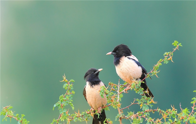 粉紅椋鳥屬Pastor僅 1種,即粉紅椋鳥Pastor roseus。體長約22厘米。繁殖雄鳥亮黑,背、胸及兩脅粉紅;雌鳥圖紋相似但較黯淡。幼鳥上體皮黃,兩翼及尾褐色,下體色淺,嘴黃色。分布于歐洲東部 至亞洲中部及西部,越冬至印度;迷鳥至泰國。我國常見留鳥于西北的開闊地帶,遷徙至甘肅及西藏西部;迷鳥有至上海及香港。結(jié)大群生活于干旱的開闊地,追隨 家畜捕食被驚起的昆蟲。