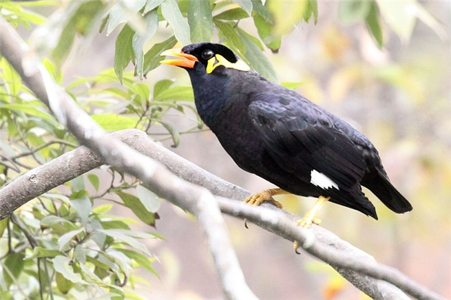 金冠樹八哥屬Ampeliceps:僅 1種,即金冠樹八哥Ampeliceps coronatus。分布于印度東部、緬甸、中國南方及印度支那,不定期的迷鳥至云南南部西雙版納,在廣東沿海也有記錄。特征為具翼斑及頦黃色,臉頰裸露 皮膚粉黃色。成年雄鳥頭頂亮麗金色;雌鳥似雄鳥但黃色區(qū)域較小。虹膜褐色;嘴粉紅,嘴基偏藍(lán);腳橘黃。高亢的金屬般哨音及似鈴聲的叫聲。結(jié)小群活動(dòng)于林冠 層。每年數(shù)百只在我國市場出售。