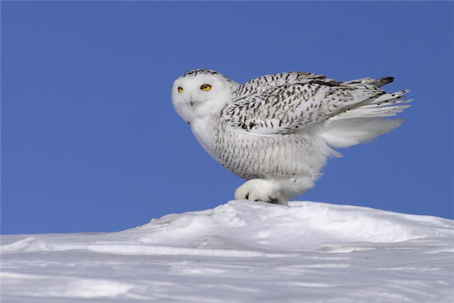 雪鸮是一種猛禽,屬于體形較大的鸮類,體長約為50-71厘米,雌性平均體長為66厘米,雄性平均體長為59厘米,雄性體型明顯小于雌性;由于該物種分布在高緯度和高海拔的寒冷地區,因而通體幾乎純白色,體羽端部近黑色,雪鸮頭圓而小,面盤不顯著,無其他鸮類常見的耳狀羽簇,嘴基長滿剛毛樣的須狀羽,幾乎遮住全嘴。雄鳥通體白色,眼先和臉盤微沾淺褐色和雜有少許黑褐色斑點。頸基具不甚明顯的污白色橫斑,并綴少許褐色斑點;腰亦有少許褐色斑點。初級飛羽具橫斑。從第3枚開始外翈橫斑增多,內翈僅先端具1-2枚橫斑;第一枚初級飛羽內翈,第二枚至第四枚初級飛羽內外翈均具缺刻。下體幾純白色,僅腹部具細窄的褐色橫斑;跗蹠和趾被白色絨羽,幾乎遮住全爪。尾羽白色,幾達尾尖。腋羽和翼下覆羽亦白色。