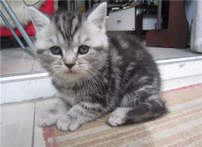 (銀色標準斑Silver Classic Tabby,銀色魚骨斑Silver MackerelTabby):整體顏色,包括嘴唇和下顎,蒼白色,干凈的銀色。濃密的黑色斑紋。銀色斑紋遺傳基因是漸變色象刺豚鼠身上的斑紋,所以底毛是白色的。鼻頭顏色為磚紅色。爪墊為黑色。眼睛顏色為綠色或淡褐色。綠色比較理想。